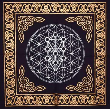 Altar cloth with the sacred geometry sign of "The Tree of Life" in the center. Gold, silver, & black in color, 100% cotton.