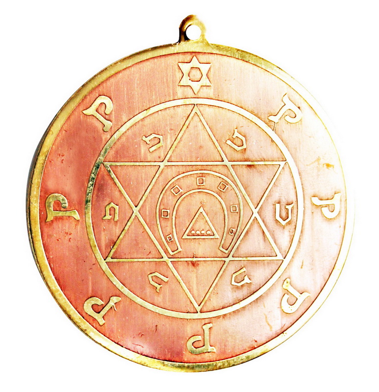 Faithfully reproduced from the Key of Solomon talismans and Medieval amulets in the Warsaw Museum, these unusual brass and copper amulets are presented with their traditional attributes described in their display case and information stickers.