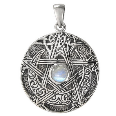 Sterling Silver Large Moon Pentacle Pendant with Rainbow Moonstone