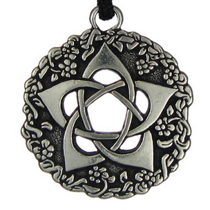 Excelsior Pewter, one inch in diameter. Comes with a black adjustable cord, and a booklet describing the design.