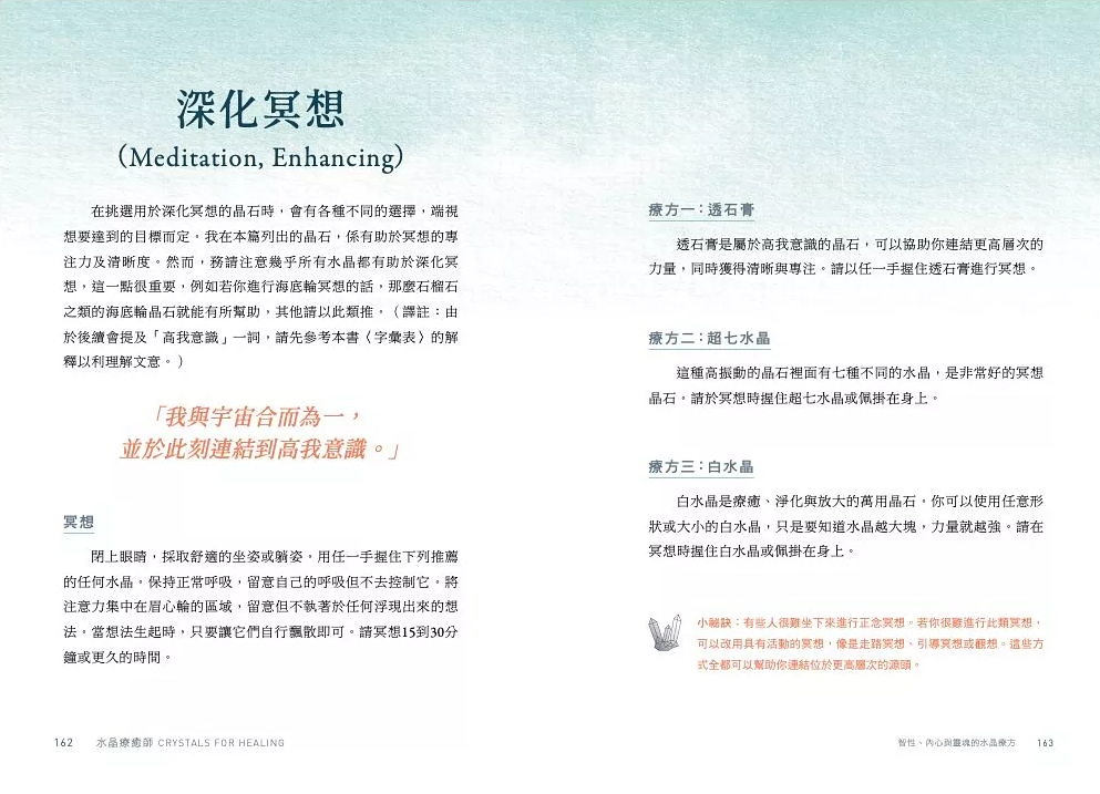 結合水晶運用的冥想、肯定語句及觀想,將可協助你將需要的能量專注於實現自己想要的改變,是將自己的能量往正面方向引導的有效方式。