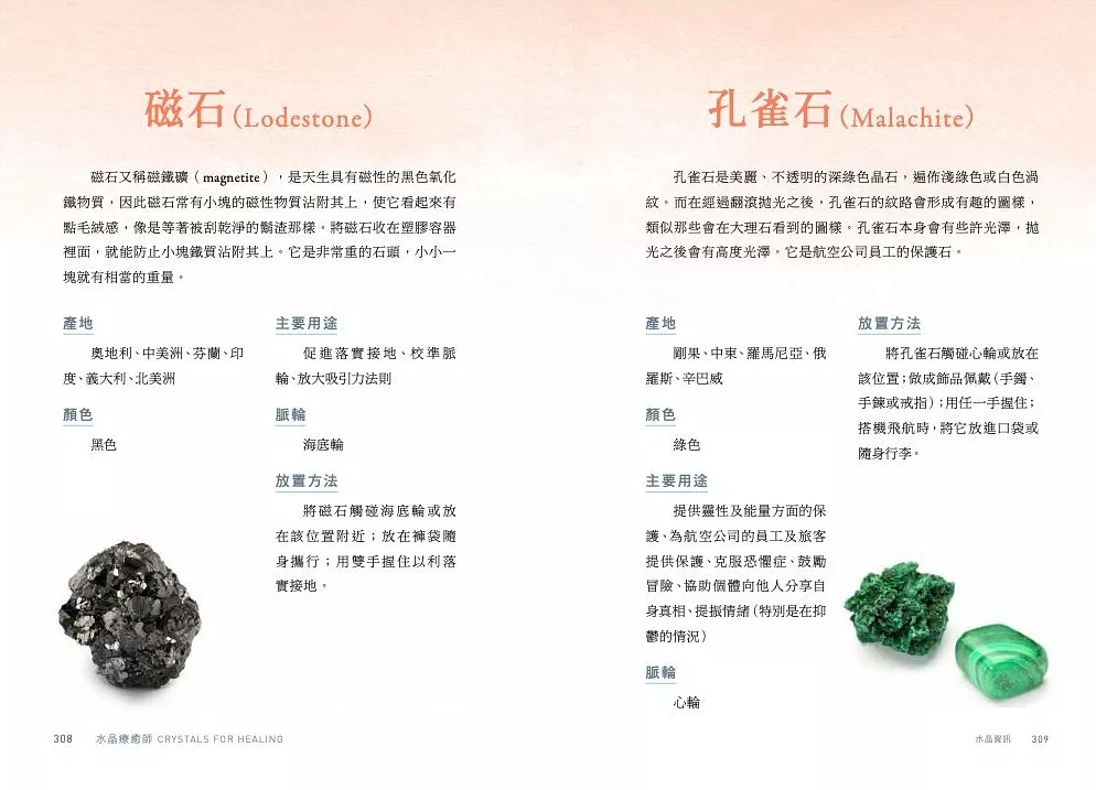 ◎列明99種水晶的簡要資訊,包括顏色、主要用途、對應脈輪及建議放置方式。