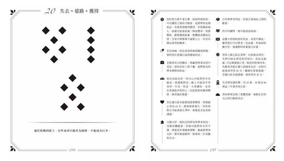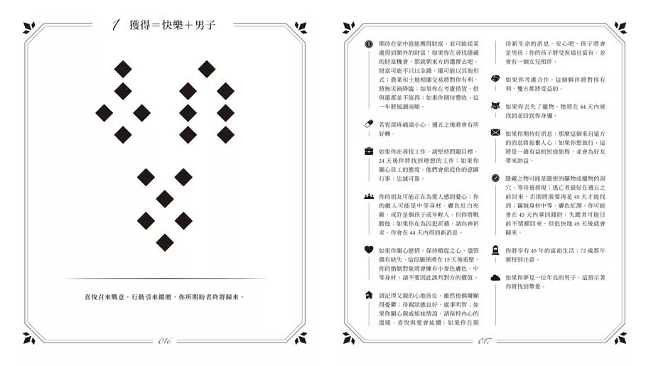《地占解答之書》將古老的占卜智慧凝縮精練,再化為易讀的文字,協助我們在混亂的日常中找到方向。當情緒糾結、選擇分岔、或人生停滯之時,它像是一盞靜默的燈,照亮人們尚未察覺的可能性。透過簡易的占卜,讓古老的圖像智慧,成為生活中最踏實的指引吧!