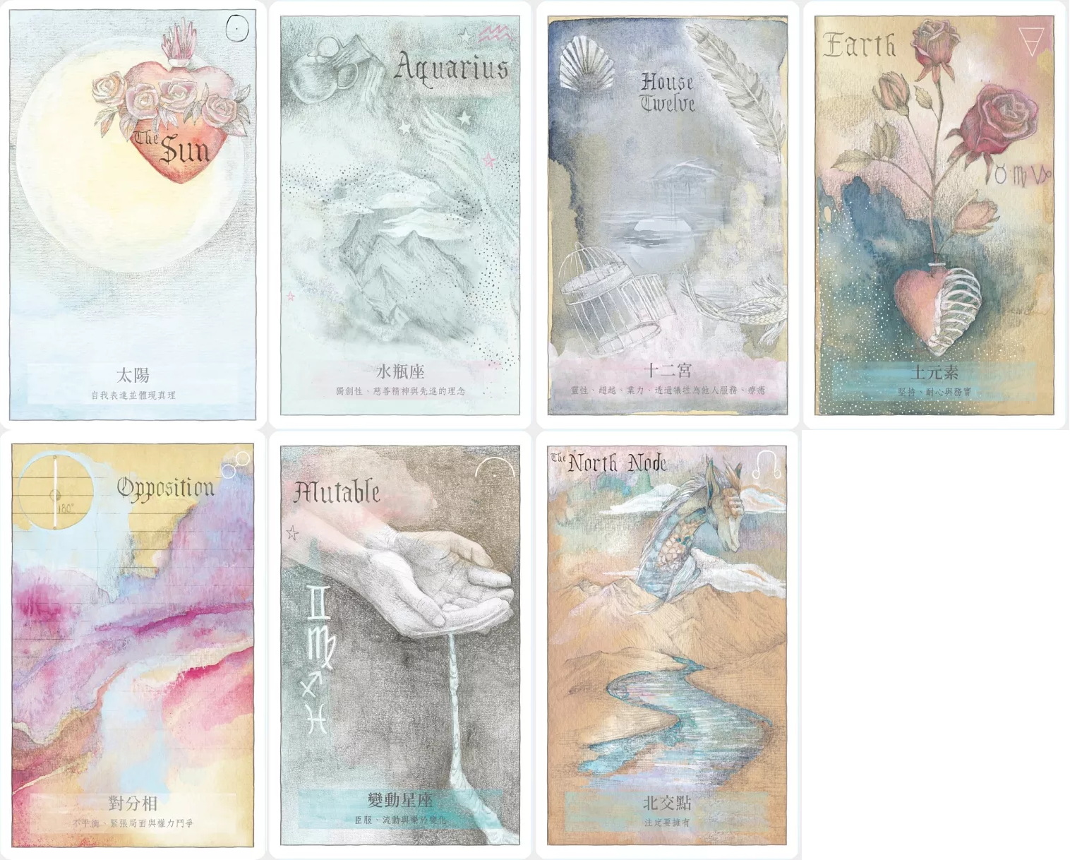 從太陽、月亮到黃道十二星座,再到神秘的命運交點,每一張牌,都是宇宙要給你的專屬訊息。帶領你在浩瀚繁星中,探索自己的靈魂旅程與業力命運。