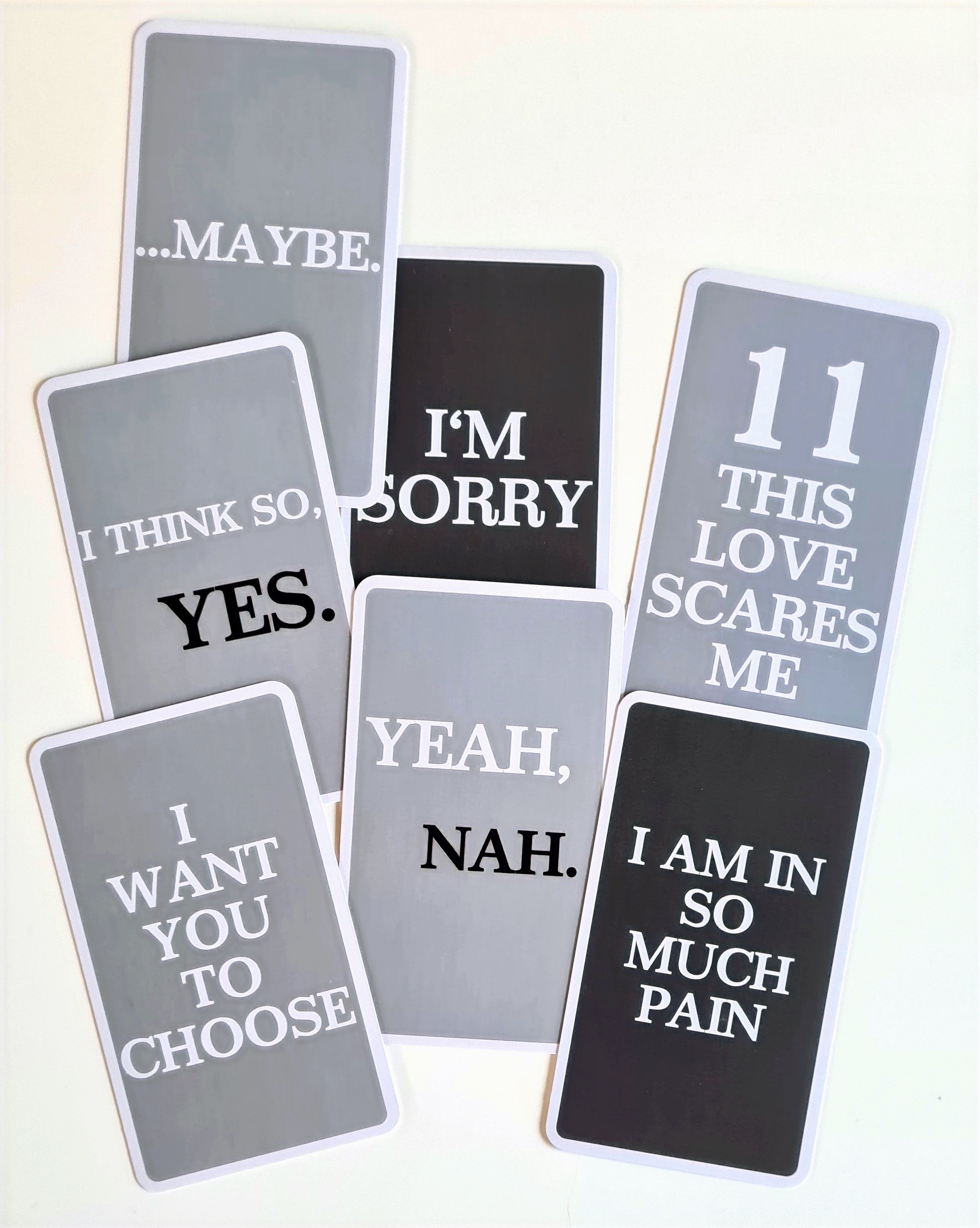 Black cards are cards that represent the many facets of The Devil XV card in traditional tarot. These cards are very important to me as they illustrate the specific barriers you connection is facing - co-dependency, addiction, substance abuse, unhealthy attachments, unrealistic expectations and of course, over-sexualised behaviour that could be stunting emotional development.