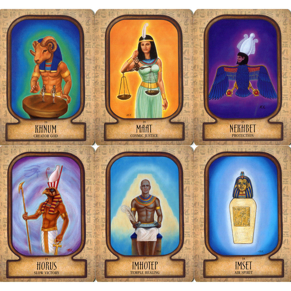 All the major gods and goddesses of Ancient Egypt also offer their wisdom and guidance through the beautiful artwork of renowned spiritual artist Marie Klement and the spiritually inspired writing of Elisabeth Jensen, international teacher of Auset Temple Healing and triple award-winning psychic. Elisabeth is also author of the popular Isis Lotus Oracle Cards and her strong connection to the divinities comes from leading many sacred journeys to Egypt.