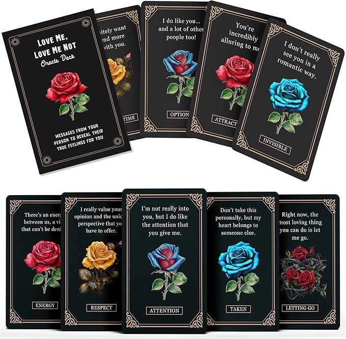 Do you have a friend who you suspect has deeper feelings for you? Or do you wonder if your ex might be coming back into your life? The Love Me, Love Me Not oracle deck by Metaphoracle is designed to provide insight on love matters such as these, by helping you to determine their true feelings towards you. Think of the person whom you are wondering about, and then ask the deck to reveal their true feelings. Red roses mean they’re hot for you, blue roses mean they’re cold. This color-coded love oracle offers a unique divination system that covers the full spectrum of romantic emotions and is easy to understand.