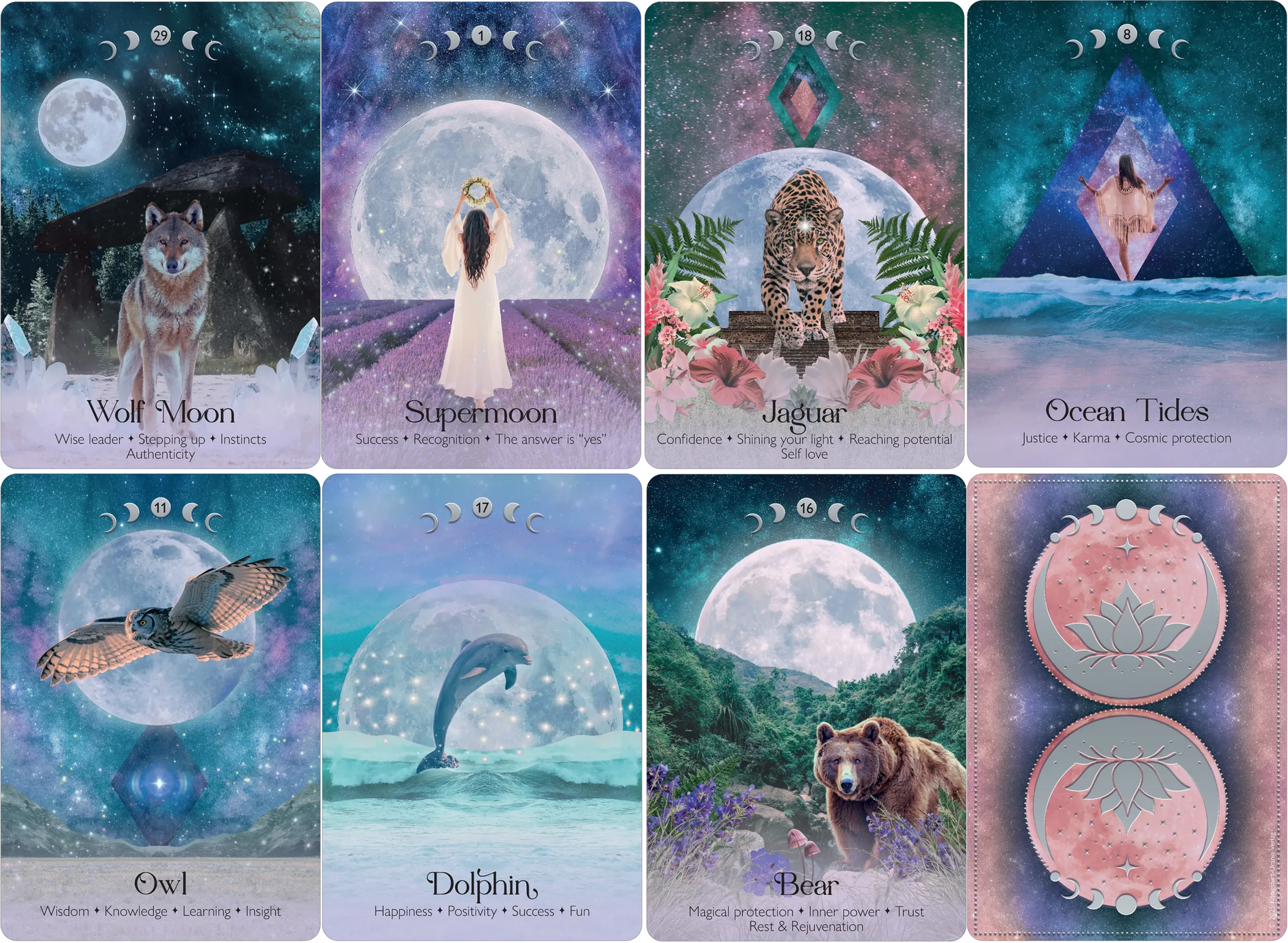 Since ancient times, the moon has been a symbol of intuition, femininity, and spirituality. With these beautiful cards by Alice Kendall, immerse yourself deeply in the fascinating magic of the moon: Discover the moon phases, lunar goddesses, and animals of the moon that accompany you on your journey to your inner truth.