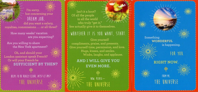 The Notes in this deck, set off by photographs of nature's own gorgeous and richly varied abundance, are brief passages designed to remind us that we could not possibly be more loved, more powerful or more deserving of all our hearts desire. 'Today, you are a magnet for infinite abundance, divine intelligence and unlimited love,' the Universe tells us. 'Actually, this has always been true.'