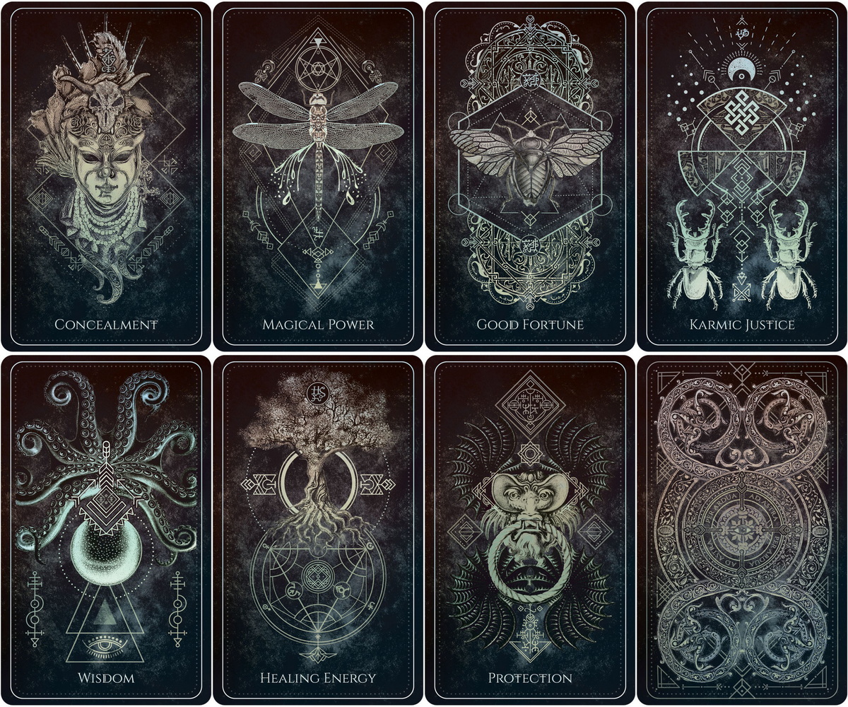 This enchanting set includes 44 black gilded-edged cards adorned with magical sigils and sacred geometry, a packet of 44 sheets of vellum tracing paper, and an illustrated 112-page guidebook. Packaged in a matte laminate, foil-accented box.
