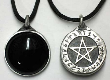 Product Descrpition: This heavy weight pewter pendant presents a front surface that is engraved with a pentagram, surrounded in a circle of Theban runes, A to Z. With the circle and the star rising above the black back ground, this alone makes a lovely and deeply mystical necklace. However, on the back you will also find the rich, black scrying disc of a sweeping, smooth convex design. This pendant is made of lead-free pewter and hangs approximately 1 1/8" in diameter, and comes with a black satin cord.
