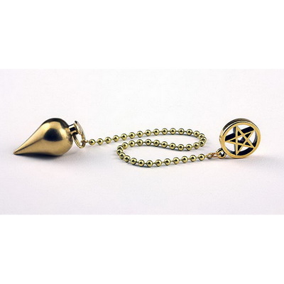 This brass classic teardrop pendulum has a 5.25-inch bead chain with a pentagram fob at the end. The pentagram is approximately 5/8-inch in diameter.