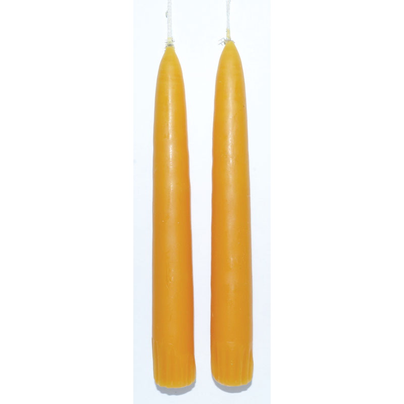 A pair of taper candles measuring 7" long x 3/4" at the base. Still joined at the wick. Hand-dipped in the U.S.A.