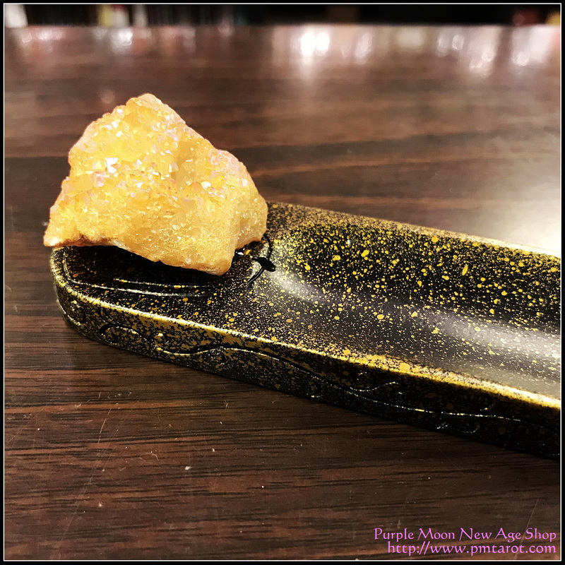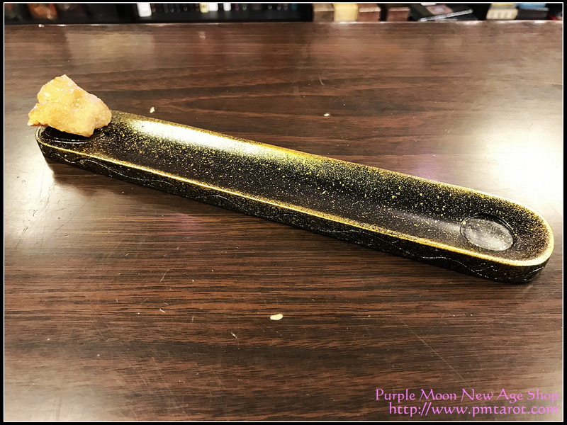 Product Descrpition: 10" flat incense burner with a dyed amethyst piece on the end. Copper and black toned tray with carved branch designs on the size. Aura orange dyed amethyst piece on the end.