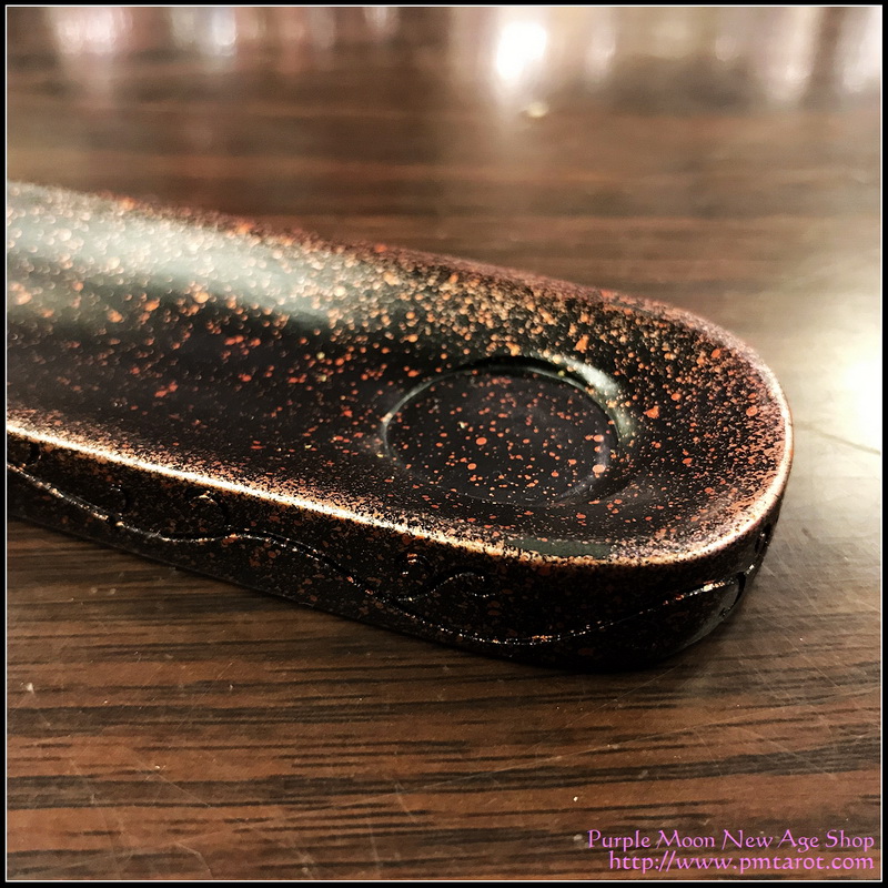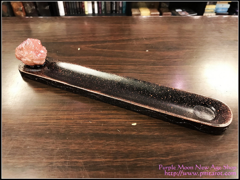 Product Descrpition: 10" flat incense burner with a dyed amethyst piece on the end. Rose and black toned tray with carved branch designs on the size. Aura rose dyed amethyst piece on end.