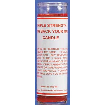 Product Descrpition: If you honor me by burning this magnificent candle that bears my name, I shall perform a special favor for you. But remember you must have confidence in me. I shall break up that romance between your husband or boyfriend and that other woman, or put an end to that romance between your wife or girlfriend and that other man. Than I shall magnetize your mate back to you and he/she shall love you with a passion you have never known.