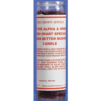 Product Descrpition: Dressed, Our Crown Jewels, I am the Alpha and Omega Sacred Heart Specially Blessed Better Business Candle.