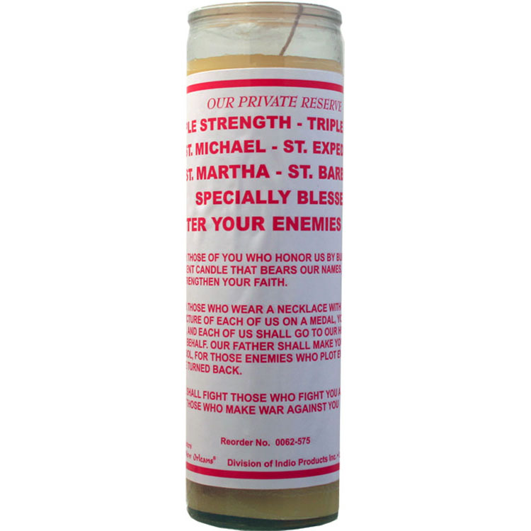 Product Descrpition: Candle is dressed with glitter and oils. Our Private Reserve Triple Strength, Triple Action, St. Michael, St. Expeditus, St. Martha, St. Barbara Specially Blessed Master Your Enemies Candle