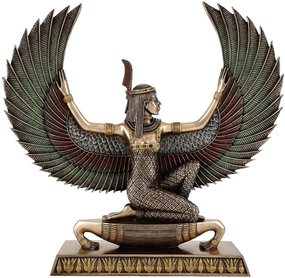 A regal depiction of Isis with spread wings. Detailed silvery base with gold and copper red highlights. Hand Painted Resin