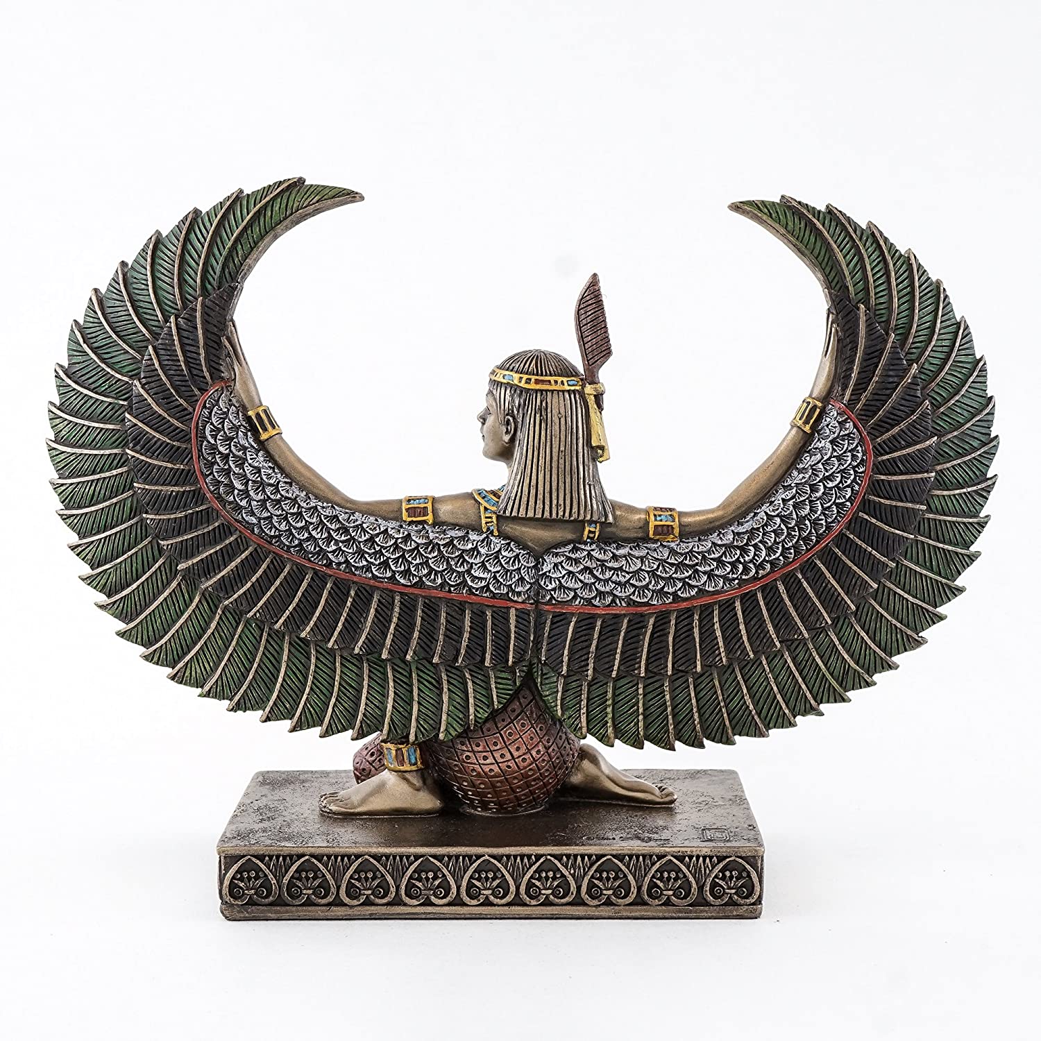 A regal depiction of Isis with spread wings. Detailed silvery base with gold and copper red highlights. Hand Painted Resin