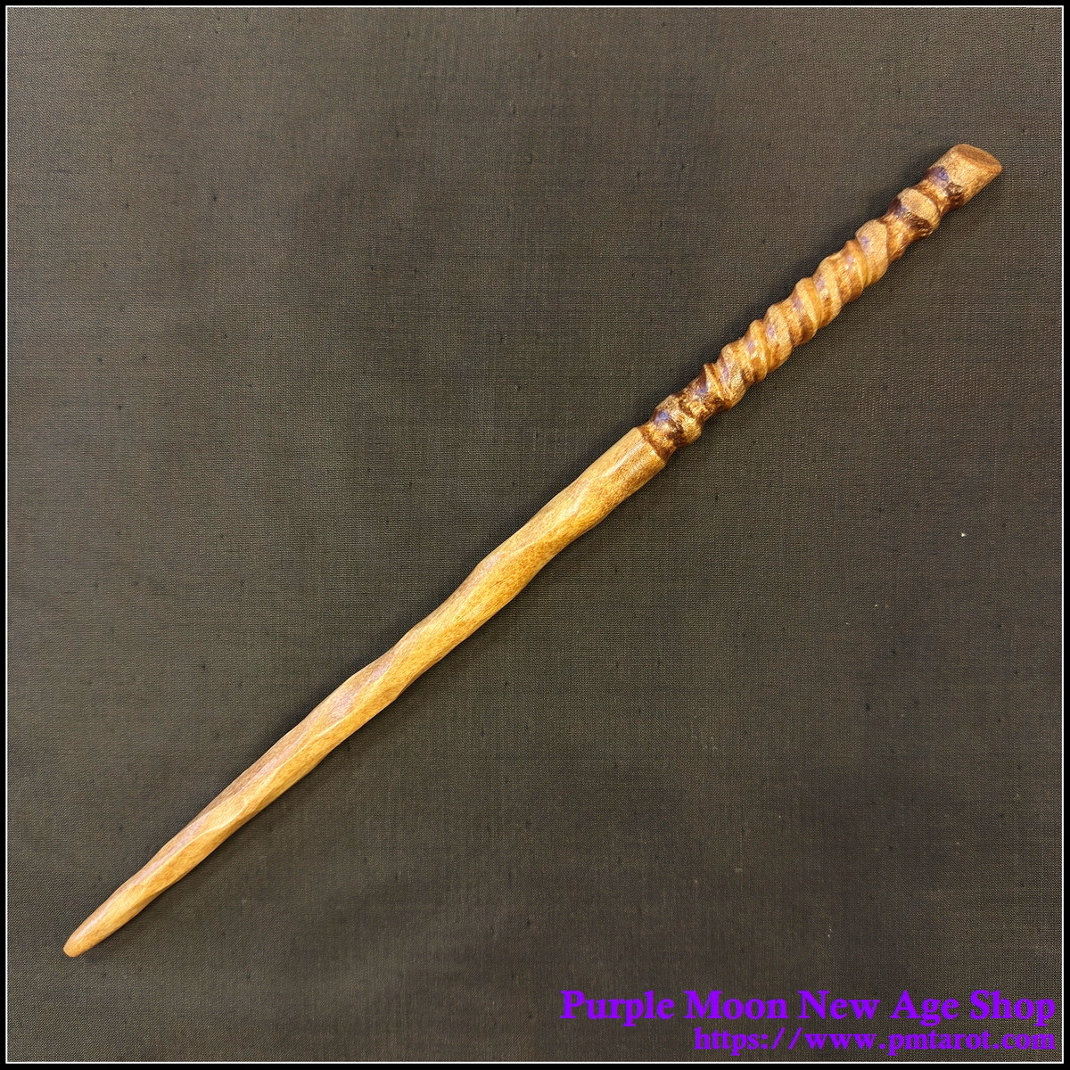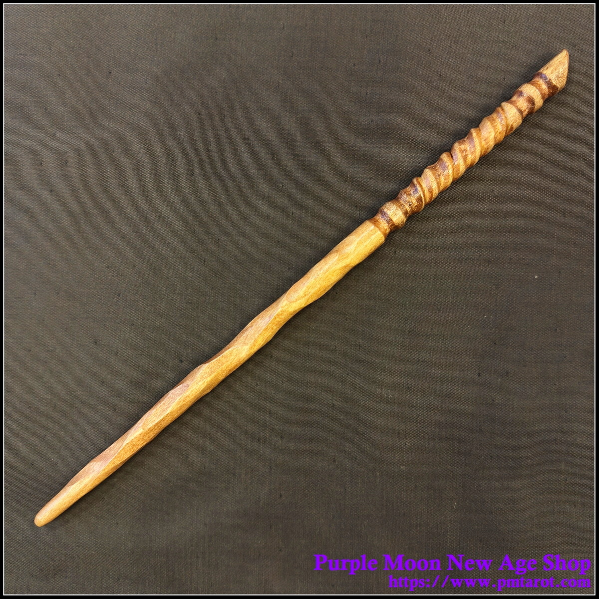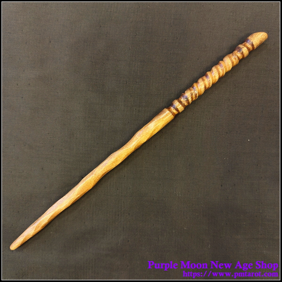 This wand is made from one piece of Birch, making it nice and sturdy for years of spellcasting. The handle has been given a solid dark stain; the tip has had the stain rubbed off, leaving the grain to show through.