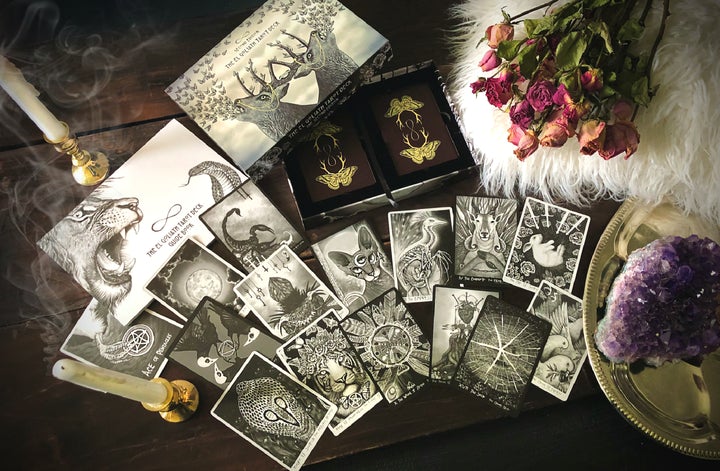 Alchemical, Shamanic, Shadow Tarot Manifesto suited for spiritual exploration, readings, and guidance! The El Goliath Tarot Deck is comprised of the traditional 78 card RWS Tarot system, and features an additional 17 bonus cards that are unique to the Tarot.