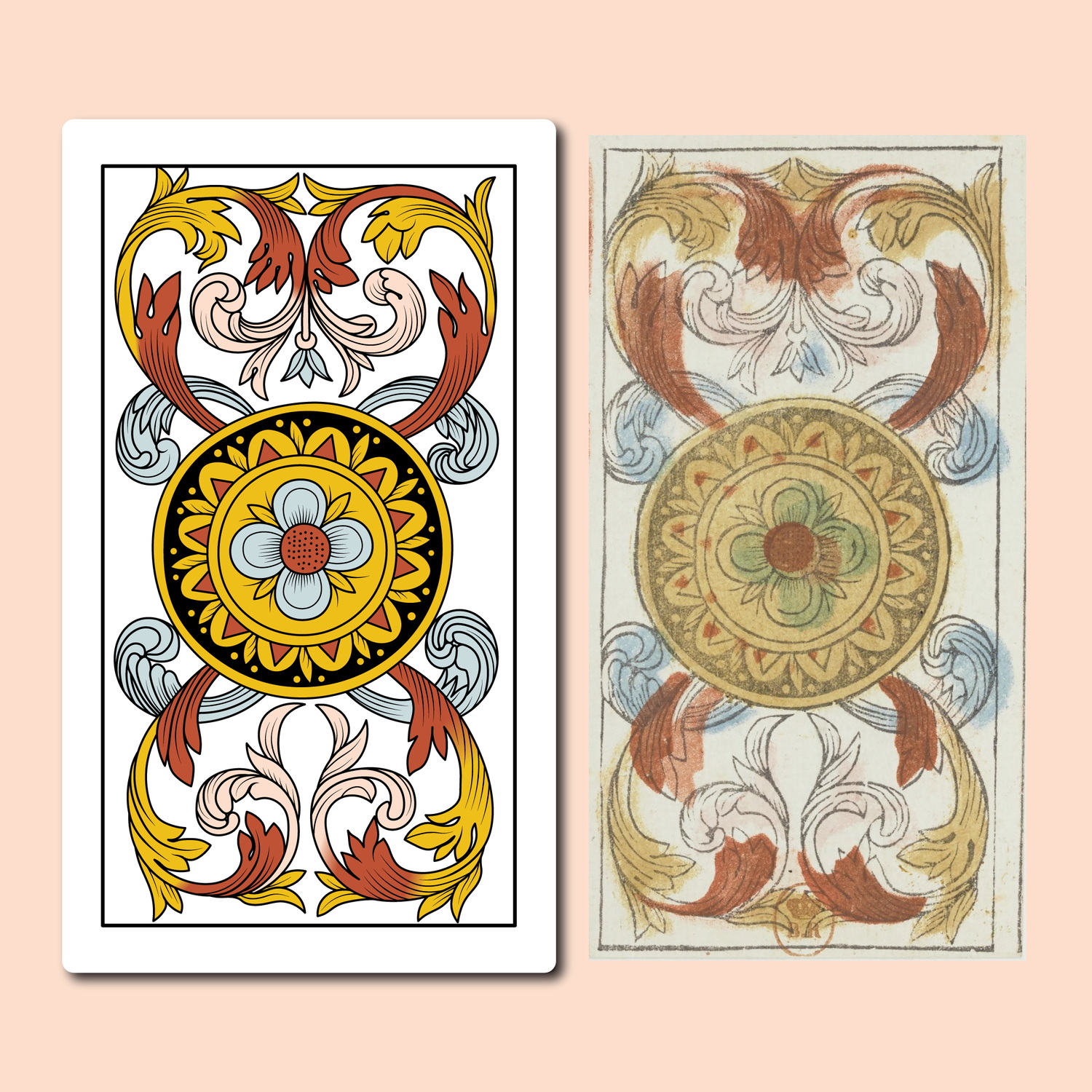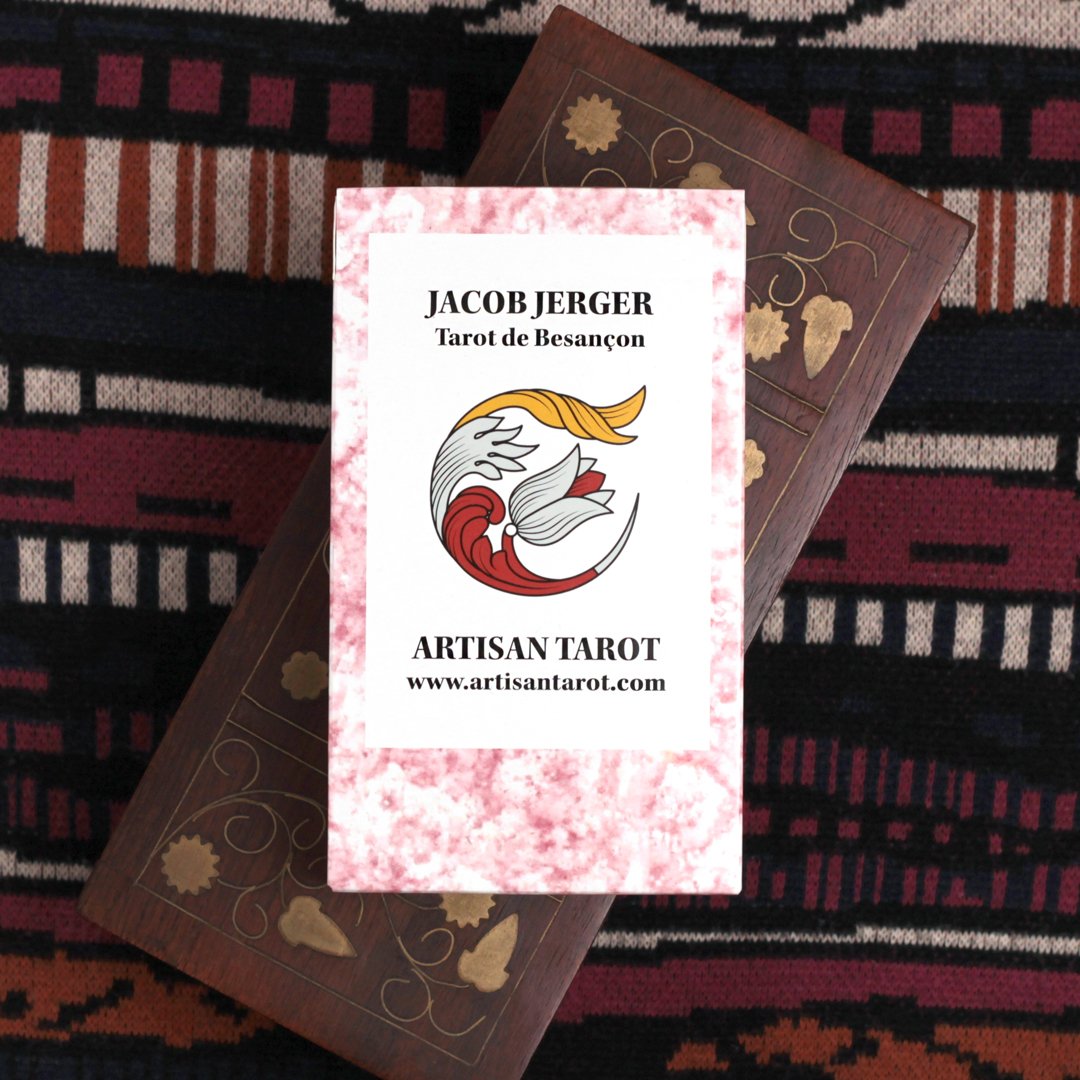 This restoration is based on the 1820-1845 tarot deck createdby German-born master cartier Jacob Jerger in Besançon, France. The original decks were printed from carved woodblocks and colored with stencils.