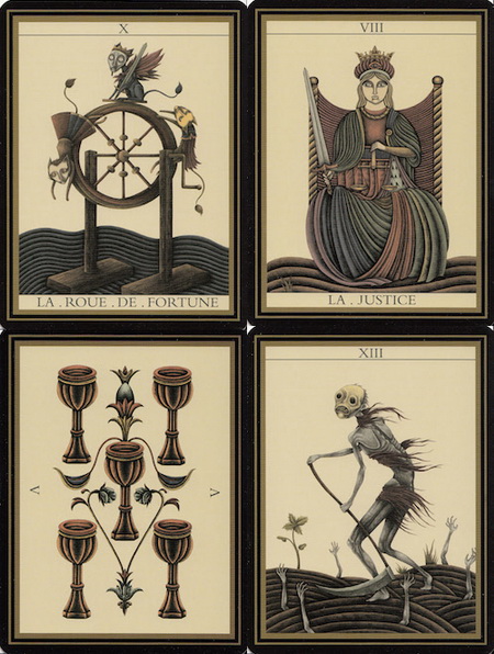 Product Descrpition: The box "The Black Tarot" contains a rich and original vision of the Tarot of Marseille. Drawing from its earliest origins, this tarot contains clues about medieval French life. His iconography contains details on the older versions of the game and immerses the tarot lover in the heart of the fifteenth century society, informing about the beliefs, rites and characters of the time. Cards embellished with gilt gold edges.