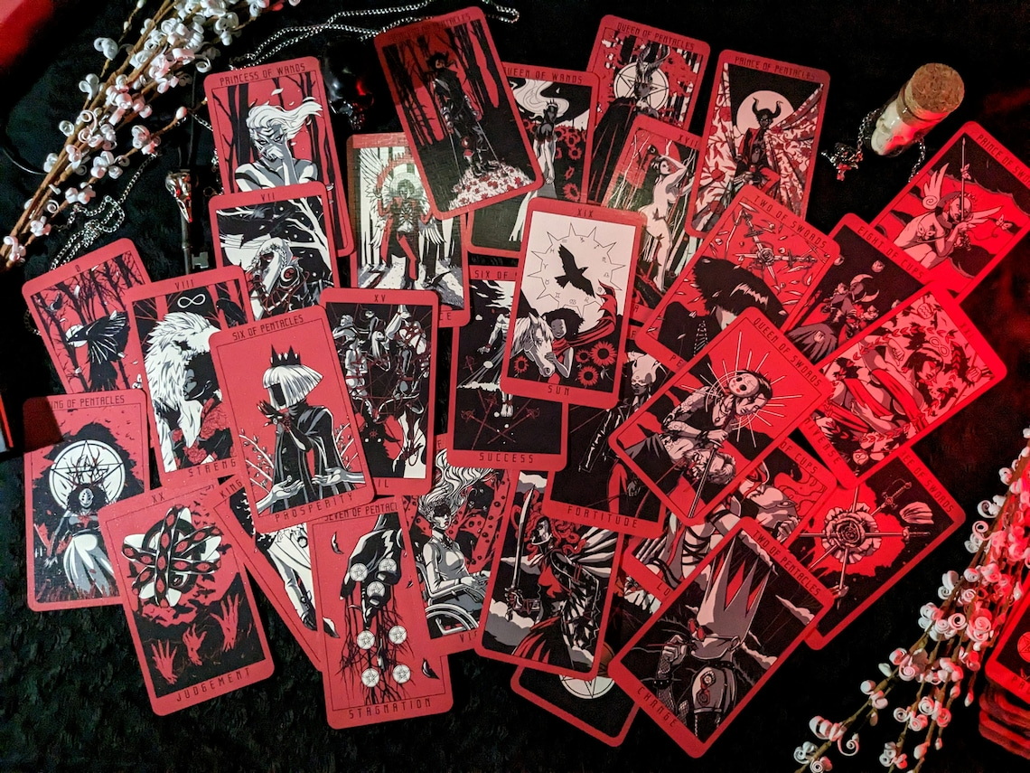 Each card is drawn in a red, black and white color scheme that keeps the whole deck unified in one consistent look and feel. The characters in the deck are a diverse cast that bring to life the varied beauty of the setting and its inhabitants. Every card meaning has a considered mediation between its different sources and as such you will see a melding of traditions.