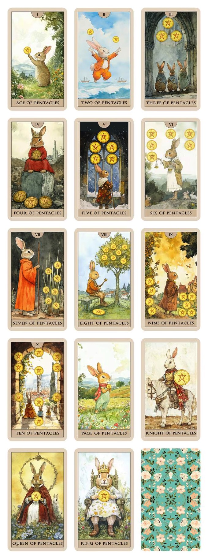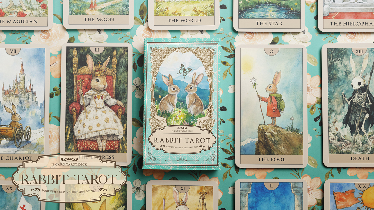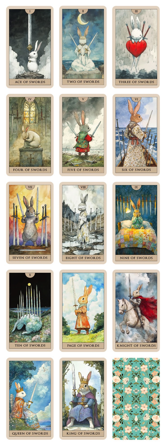 This tarot deck is rabbit-themed, blending elements of both rabbits and humans. The art style is watercolor-inspired, with fairy tale books as the main reference. Each tarot card showcases a unique rabbit character, each with their own personality, backstory, and symbolism.