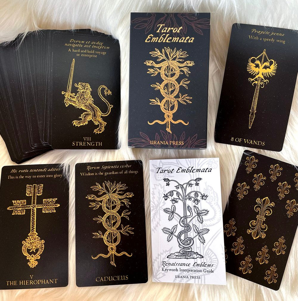 Product Descrpition: Tarot Emblemata is an 88-card deck of 78 Tarot cards & 10 Oracles featuring illustrious Renaissance Emblems from 16th century France and their enigmatic mottos aligned with the Major and Minor Arcana cards of traditional Tarot archetypes. Tarot Emblemata represents the evolution of Emblem designs through history and their enchanting, transcendent, and universal power taking new form.