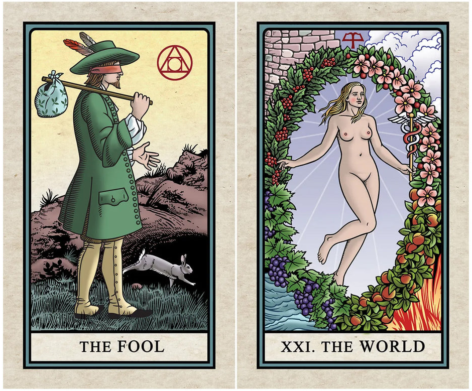 Like the sixth edition, this version includes a twenty-second trump, Veritas, described at the end of the trumps. The Fool and trumps in The Alchemical Tarot each relate to an alchemical material or process, part of the Magnum Opus that leads to the creation of the Philosopher’s Stone. This mystical catalyst transforms what it touches into its highest form. Composed of the mysterious fifth element, it can cure any illness, turn lead into gold, and turn an ordinary person into an enlightened sage. Each trump displays a symbol of its alchemical process, with the Philosopher’s Stone represented by the World card.
