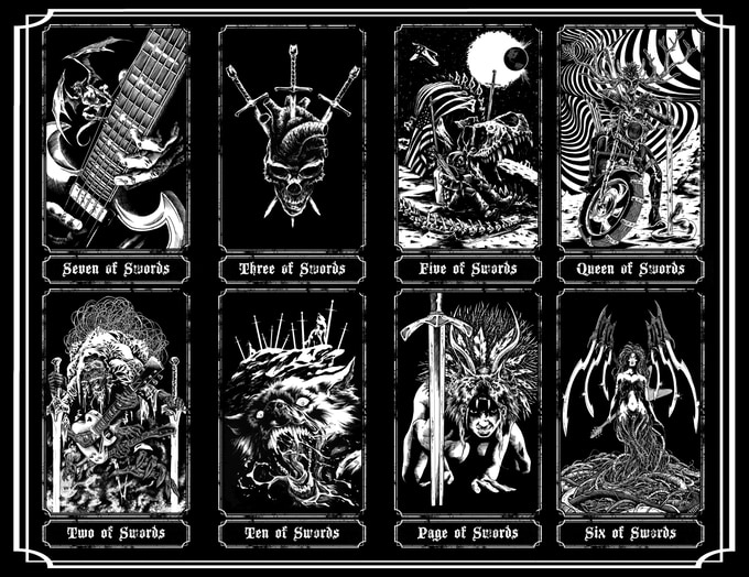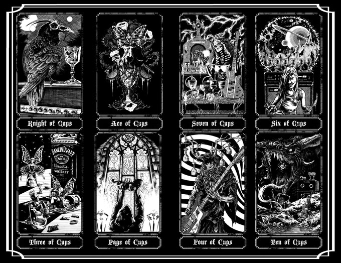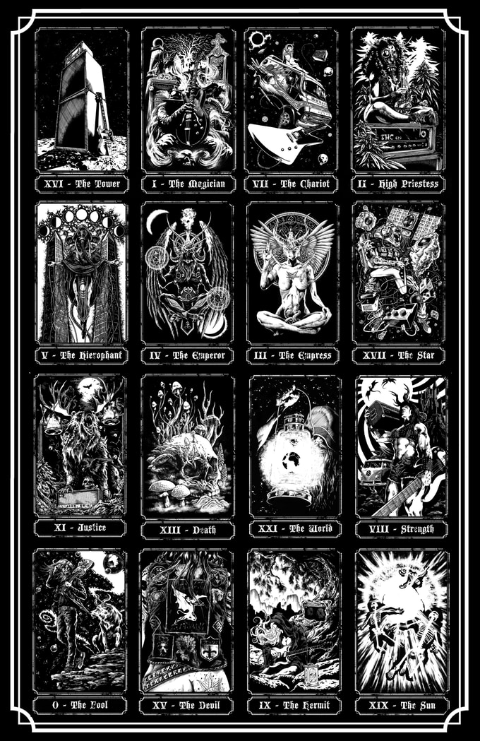 Product Descrpition: The Hand of Doom tarot. A 78 card tarot deck based on the classic Rider-Waite arcana but featuring brand new Doom Metal and Dark Fantasy themed artwork. Guitars and amps compete with monsters and magic to determine your fate. Tattoos and Fae, Werewolves and Whiskey, Science Fiction mixed with Sorcery. Saddle up a Chopper or saddle up a Dragon, spark one with a Goblin, lay down some tracks in the upper atmosphere with a Supernaut. Pure 70s Pulp is represented in each card. Follow the smoke to the riff filled land.