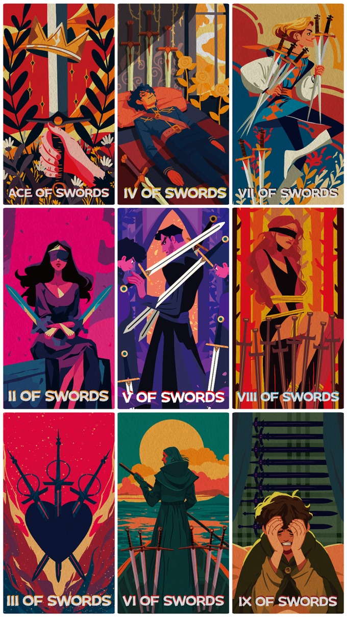 For our card design, we’re embracing a flat illustration style that balances bold, vibrant colors with a clean, elegant simplicity. Each card features a minimalistic outline, crafted to capture layers of meaning through subtle details, letting complex themes and symbols emerge without overwhelming the eye. Under the moonlight, life pulses, and dimensions intertwine, revealing a vast and mystical world. We approach it with humility, embracing the awe it inspires. In the illusion of time, love stands as our sole, unchanging truth.