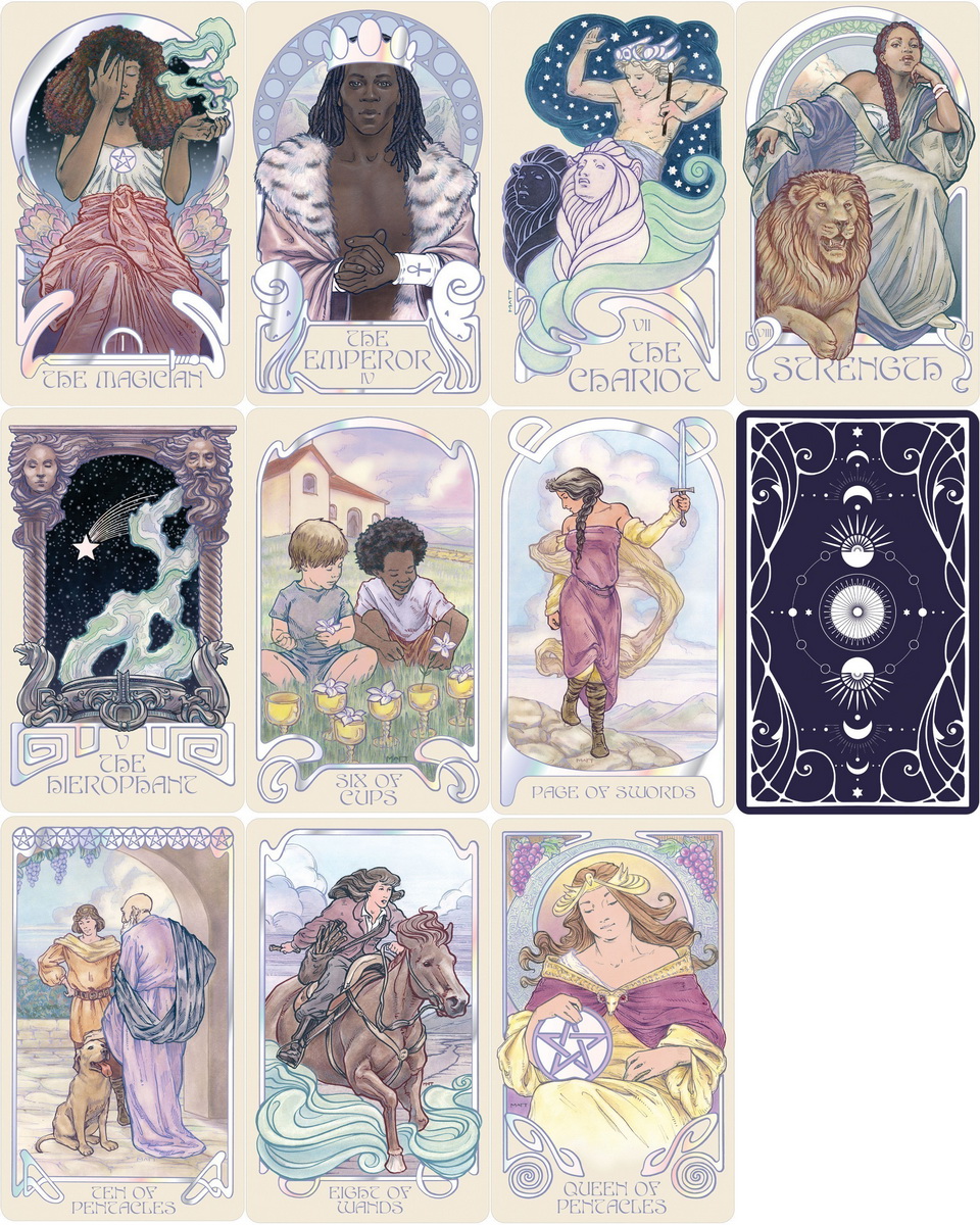 Product Descrpition: In creating Ethereal Visions Tarot, Matt Hughes has drawn inspiration from the Art Nouveau movement, adopting its distinctive style and meticulous approach to craftsmanship. The artist created two additional cards to supplement the traditional Major Arcana. Every detailed image in the 80-card deck is hand drawn and colored. This Luna Edition includes revised artwork reflecting greater diversity and each card is illuminated with iridescent silver foil stamping. Includes a 140-page expanded, full-color guidebook.