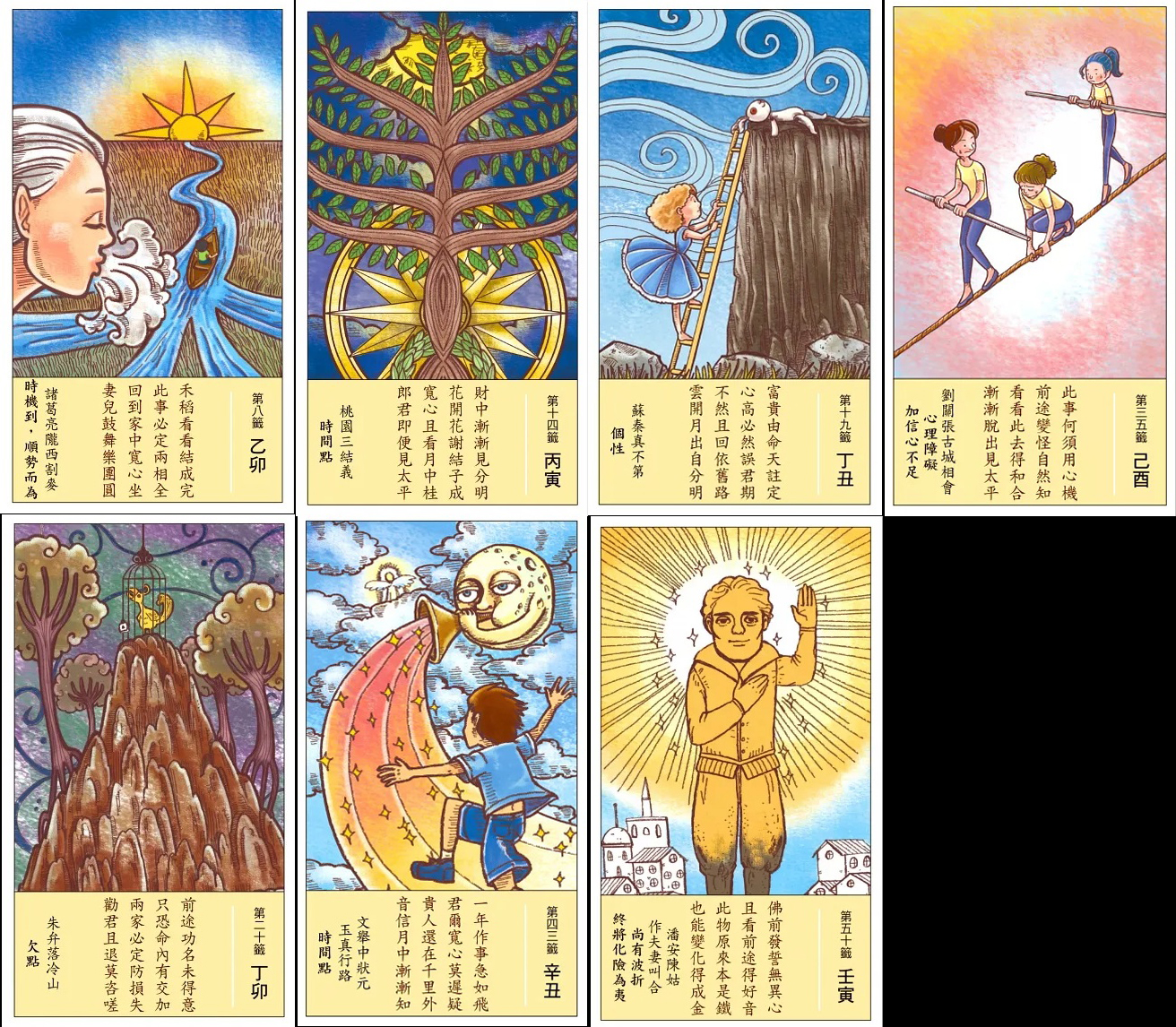 *精美插畫全彩印製:每張都以豐富的象徵繪圖點題,讓你更容易理解籤詩,好抽好看好有趣,值得珍藏。