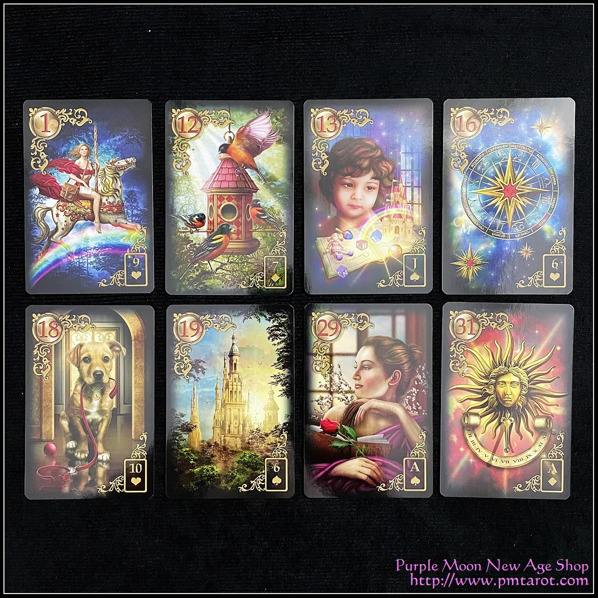 Gilded Reverie Lenormand showcases the digital talents of Ciro Marchetti with captivating imagery on 47 gilt-edge cards.This Expanded Edition deck features eight special supplemental cards, including four that have not been previously published.The extra cards are: Time, Bridges, Dice, Mask, Well, Compass, Labyrinth, and Magnifying Glass. For this deck Ciro also provides an extra Man, Lady, and Owl card to enhance Lenormand readings.The 80-page guidebook provides expert instruction by Lee Bursten, Donnaleigh de LaRose and others for reading with this 47-card deck.