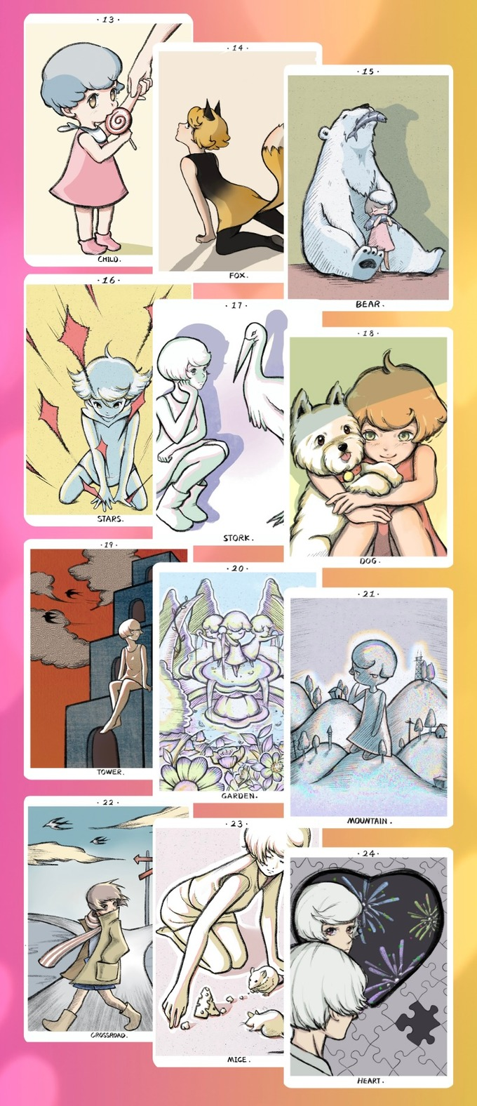 The deck's art style exudes a pure, girlish charm, each card a canvas reflecting the creator's journey and childhood memories. Through these cards, the creator shares her transformation from a whimsical child into a visionary artist, inviting you to restore your own youthful dreams in your divination.