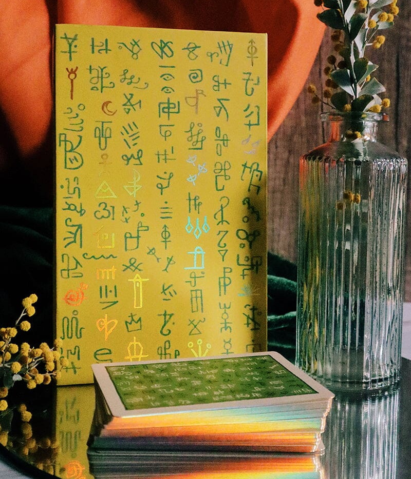 The origins of Lenormand can be traced back to 1800. Lenormand is comprised of a set of 36 pictorial symbols that can be used to tell a story and offer insight into the future. When I first started learning Lenormand this idea of reading a Grand Tableau was daunting to me- 36 cards is a lot of information to take in at once. So I set out to create a deck that could be read quickly by color, giving the beginning reader an early advantage. In this updated version of Green Glyphs Lenormand (originally published in 2019), the box, card finish and gilding have been improved! -James