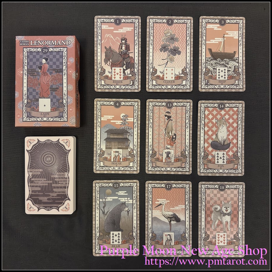 Taisho Roman Lenormand 是一套美麗的 Lenormand 牌,時尚、可愛、使用方便,而且即使觀賞它也感覺非常漂亮。作為一套即使對於占卜初學者來說也很容易使用的雷諾曼卡,它表現了一個大正浪漫的世界。城市景觀、風景以及人物的衣著都經過精心描繪,以重現當時的情景。