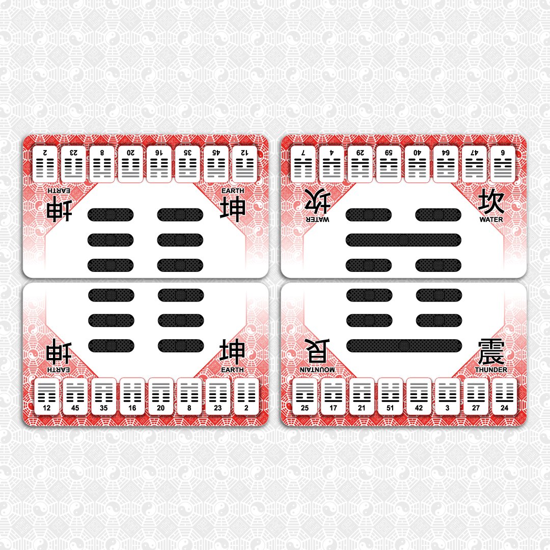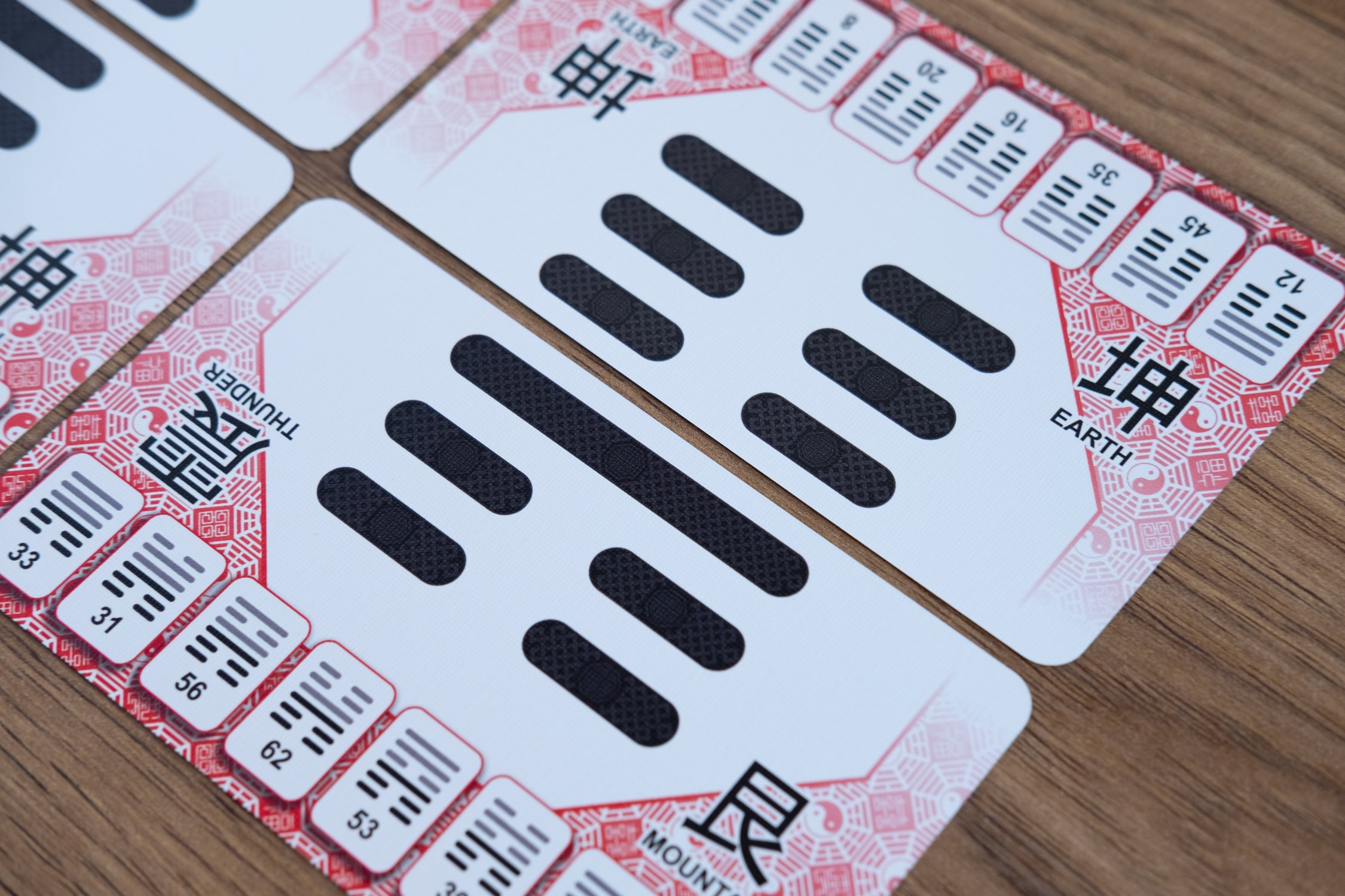This deck can be used for traditional I Ching readings, however it is uniquely designed for a reading method we call Pai (牌), a Chinese word meaning “card” or “brand”. This style of reading combines the traditional meanings of I Ching hexagrams with the “open reading” methods of modern cartomancy.