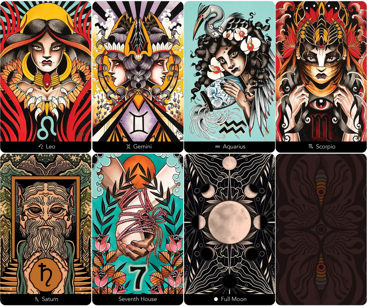 Connect with the timeless wisdom of the zodiac signs, astrological houses, planets, and moon phases with Eight Coins’ Astrology Oracle. Inspired by the celestial archetypes and cosmic energies that govern our world, these 41 cards with black painted edges deliver insights that can be applied to your daily life. Each card’s vibrant artwork was channeled through meditation and created using a blend of hand-painted and digital techniques by tarot and tattoo artist Eight Elian-James Showell. The 132-page guidebook presents full-color, enlarged illustrations for each card, along with descriptions and unique divinational messages to guide the reader through their own life changes.