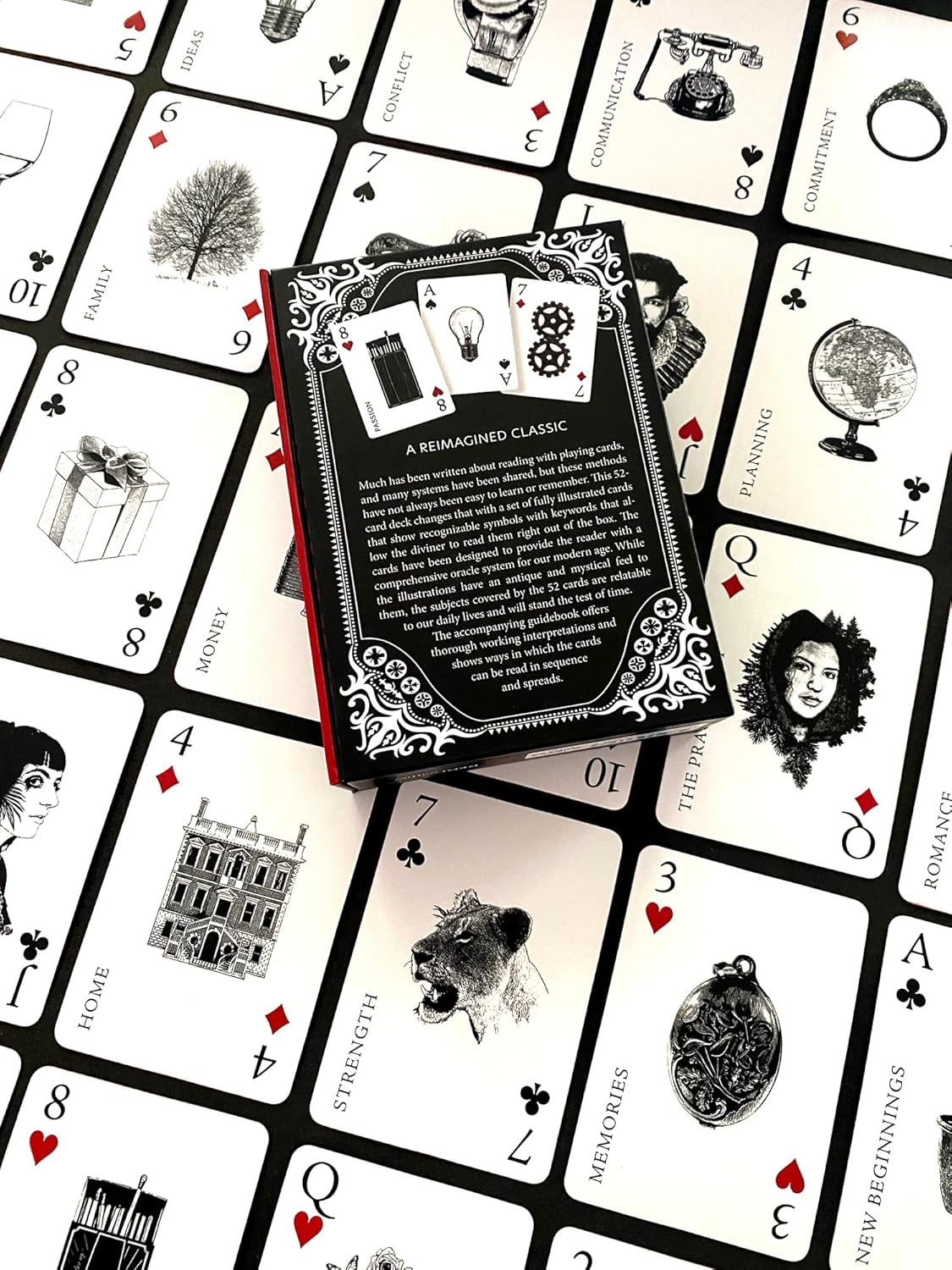 The cards have been designed to provide the reader with a comprehensive oracle system for our modern age. While the illustrations have an antique and mystical feel to them, the subjects covered by the 52 cards are relatable to our daily lives and will stand the test of time.