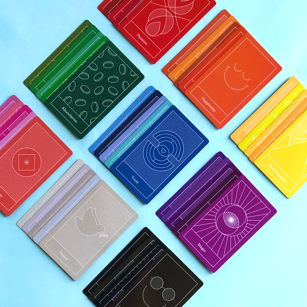 這個充滿活力的套牌用 45 張卡片探索顏色和情感之間的聯繫,每張卡片都有不同的色調。每張卡片都有一個獨特的能量狀態——比如創造力、挫敗感或反射——映射到與該能量相關的顏色。該指南提供了有關如何將卡片解釋為來自更高自我的信息的方向,以及如何通過冥想和祭壇建造將卡片的能量注入周圍環境。這個美麗而富有洞察力的牌組在每張卡片上都有現代簡約的插圖和閃亮的金屬邊緣,並附在一個彩虹色的、貼有鋁箔印章的紀念品盒中。