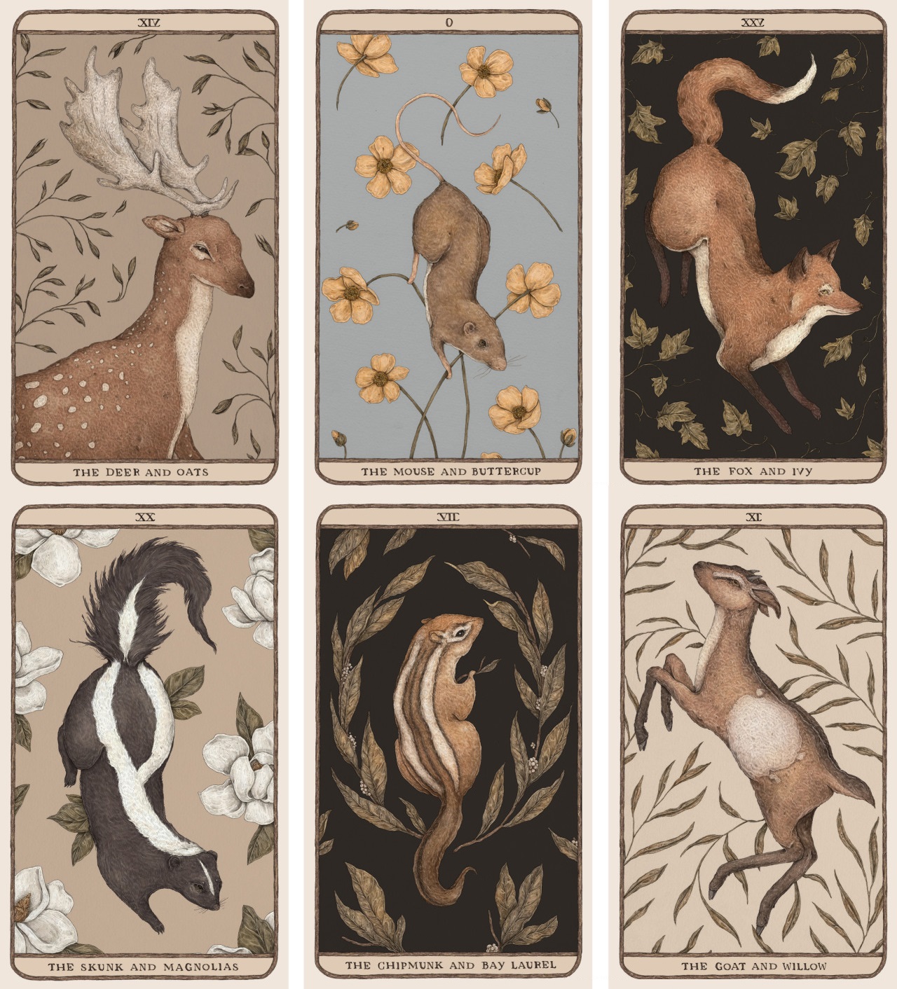 Drawing on mythology, folklore, and literature, each card in the Woodland Wardens deck features an animal-plant pairing accompanied by a distinct and thoughtful message: the hare and the oak; the finch and the peach; the hawk and the thistle. Each unique combination, brought to life in artist Jessica Roux’s detailed, historically evocative style, transports seekers to another time and place, offering insight, guidance, and an invitation to reflect on the natural world.