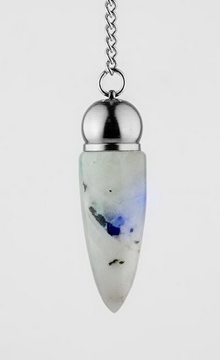 貨品介紹: This rainbow moonstone pendulum has a 5-inch curb chain with a clear quartz bead at the end. Rainbow moonstone pendulum reflects light.