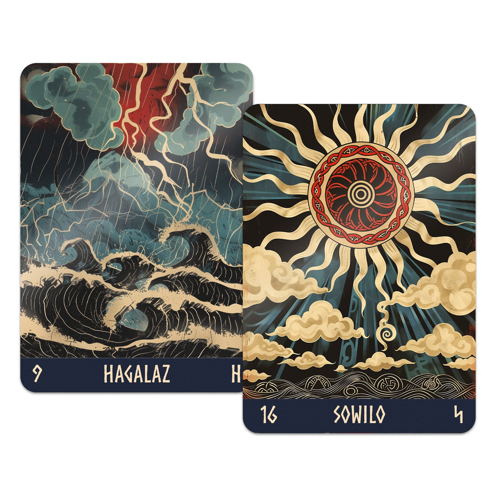 Plunge into the harsh but beautiful norse world. Runes love simplicity and conciseness, which is why the deck has only three main colors - red, blue and black. A rune is not an image, it is first and foremost a symbol.