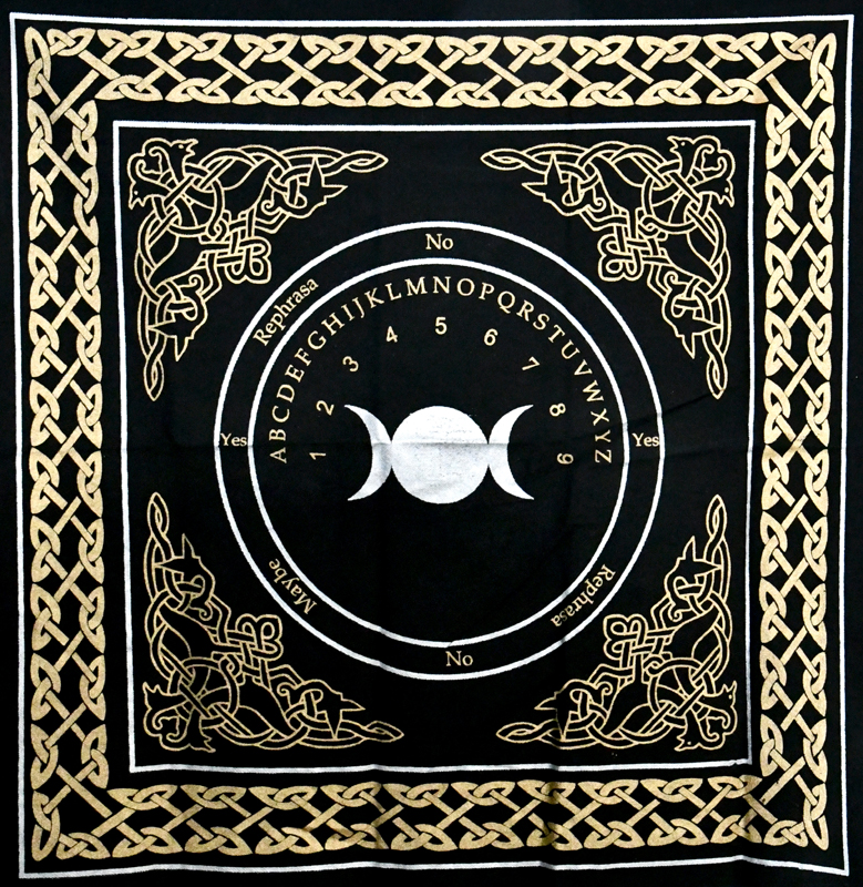 貨品介紹: Large altar cloth with rich looking gold and silver tones against the black fabric. Circular Ouija on front with the triple moon in the center. 24" x 24" Cloth with sizes, shapes and colors that may vary slightly.