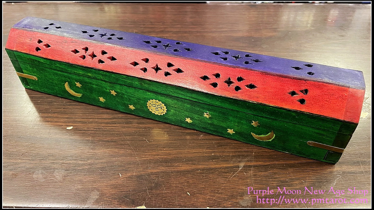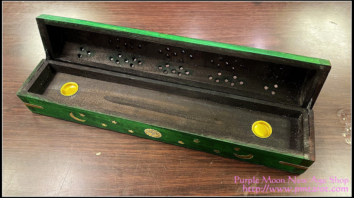 貨品介紹: This Sun and Moon Flip top ash catcher is cleverly designed and is also a burner incense older for cone or stick. It has brass inlay and the wooden box has various stained colors making it extra decorative. There is even a hidden door on the end for incense storage inside.