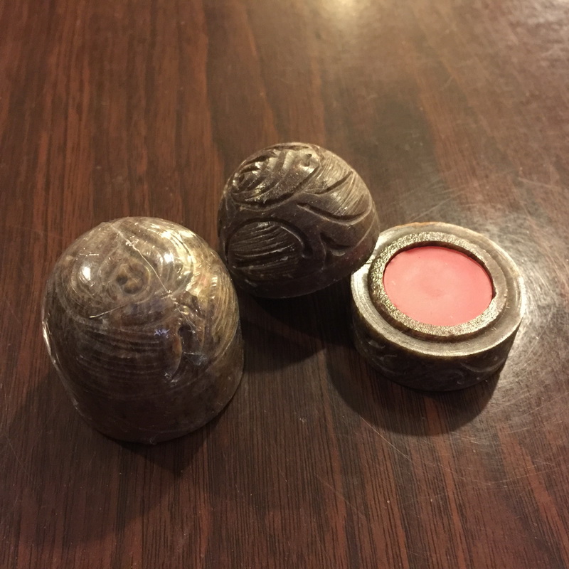 貨品介紹: Dragon’s Blood scented solid perfume made from all natural flower oils, herbs and beeswax in a unique hand carved soapstone container. randomly chosen